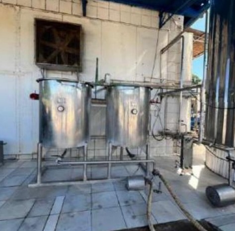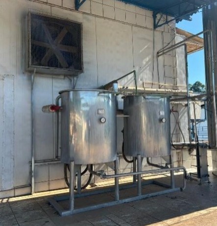 5) 2 tanques verticais em aço inox para lavagem CIP, montados sobre estrutura metálica, com registros, válvulas, manômetros e interligação por tubulação aérea. Sem identificação visível, com capacidade estimada entre 300 a 500 litros cada;
