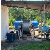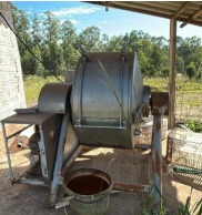 12) Batedeira de manteiga industrial, estrutura em aço com tambor horizontal em inox, motor acoplado por correia, marca Bockman. Equipamento desinstalado, com sinais de desgaste, oxidação e possível inoperância;