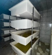 13) Tanques retangulares de salga em fibra para produção de queijo muçarela, instalados em estrutura metálica de sustentação vertical. Total de 8 unidades. Todos contêm solução salina (salmoura) em estado de apodrecimento, exigindo higienização completa;