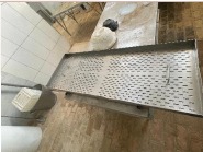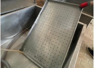 16) 5 unidades de grelha de drenagem industrial em aço inox perfurado, com furos oblongos e circulares, destinada à dessoragem de queijos em tanques industriais. Dimensão estimada: 130 cm x 60 cm. Material: aço inox (provavelmente AISI 304 ou 430). Estado: bom;