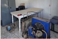 41) Mesa retangular em MDF ou material similar com pintura branca, estrutura composta por tampo liso e quatro pés torneados. Apesar da sujeira visível e do uso para apoio de objetos industriais, a estrutura geral aparenta estar íntegra, com sinais de desgaste apenas superficiais.