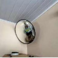 56) Espelho convexo de segurança, com moldura preta, fixado no encontro entre a parede e o teto, em ponto estratégico para vigilância de ambientes. Apresenta superfície refletiva em bom estado, sem rachaduras visíveis;