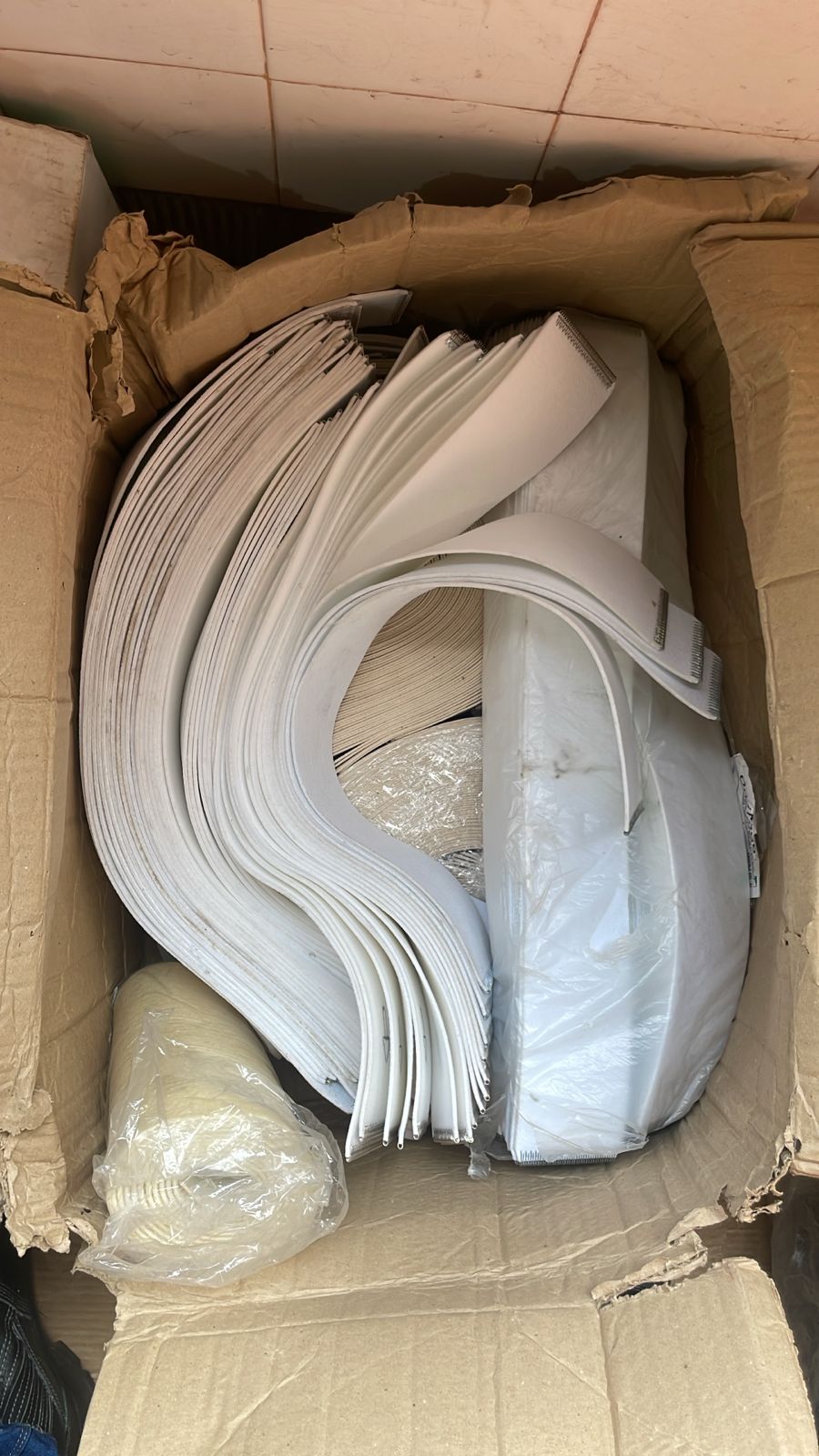 LOTE DE CORREIAS PARA TRANSPORTE/PASSADORIA (FITA DE CALANDRA): Composto por aprox. 145 unidades de diversas dimensões (incluindo 9x56cm, 9x59cm, 20x260cm e 1,90x7,5cm), totalizando uma área aproximada de 13,16 m². Obs: Itens novos e sem sinais de uso prévio. Material acondicionado emvolume, apresentando integridade física preservada e sujidade superficial mínima decorrente do armazenamento