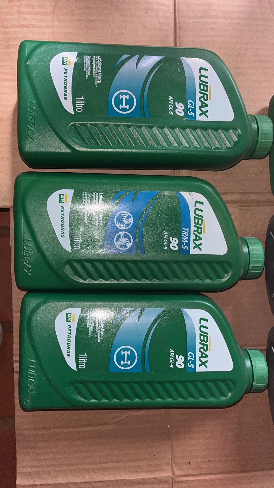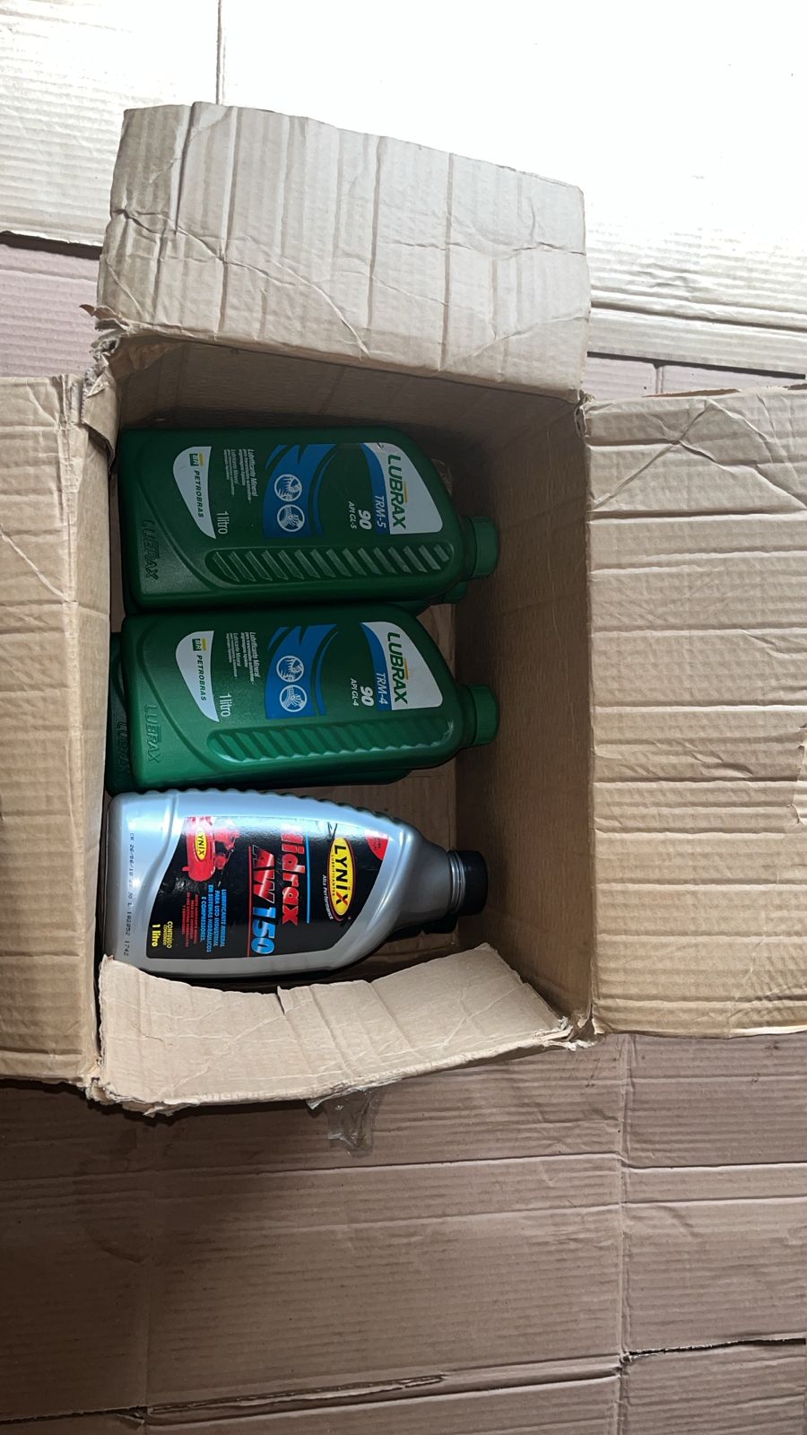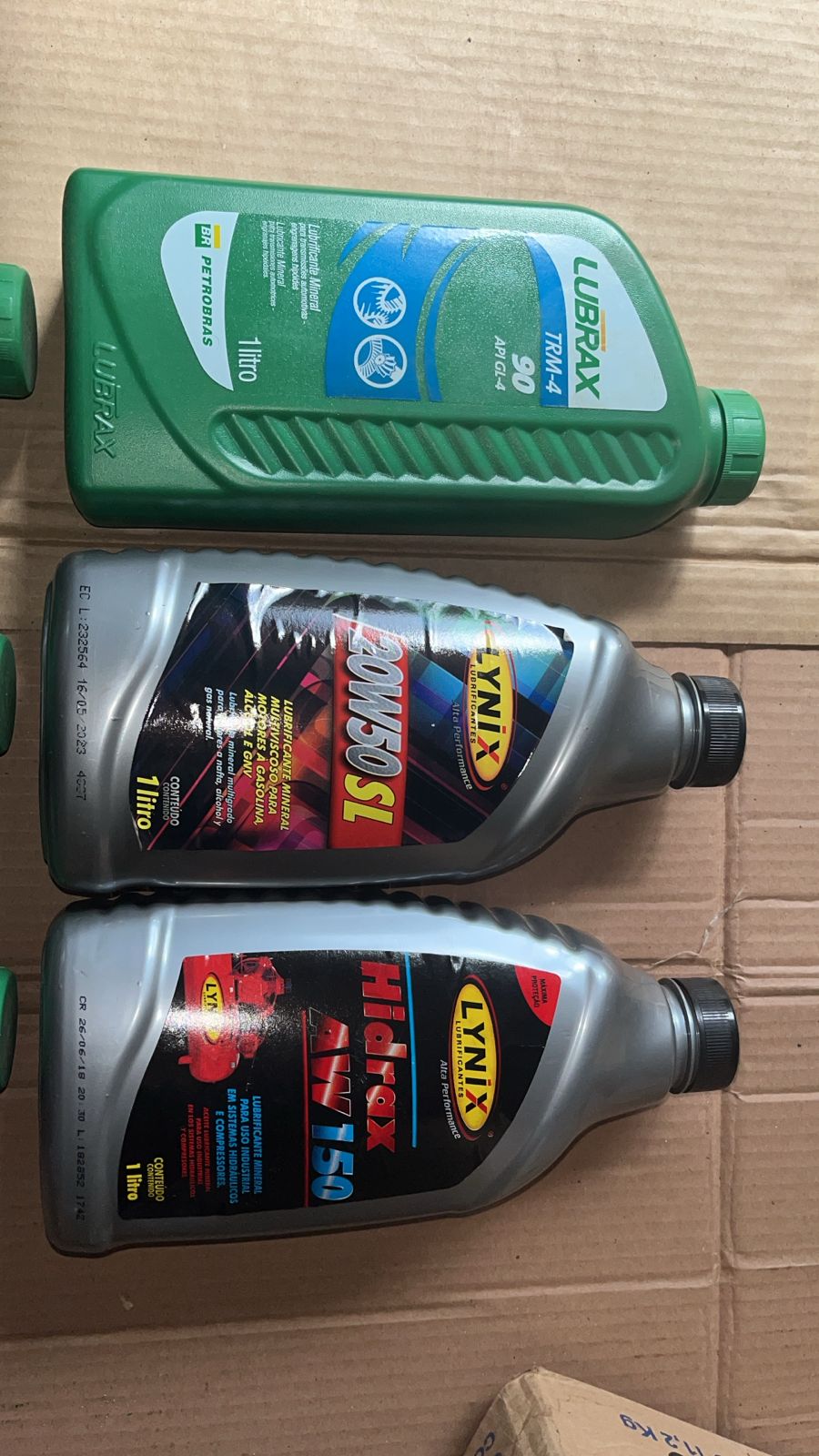 LOTE DE LUBRIFICANTES E FLUIDOS INDUSTRIAIS: Composto por 06 unidades (01 litro cada), sendo 01 óleo multiviscoso 20W50 SL (Lynix), 01 óleo industrial AW150 (Lynix Hidrax) e 04 unidades de óleomonograduado SAE 90 (Lubrax TRM e GL-5). Obs: Lacrados. Validade não verificada