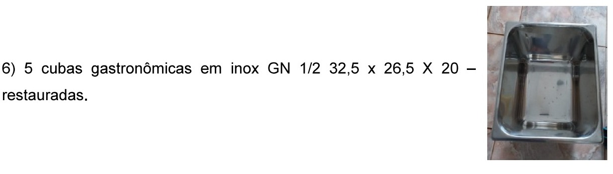 y(6) 5 cubas gastronômicas em inox GN 1/2 32,5 x 26,5 X 20 - restauradas, e,jp-fgular estado de conservação, no valor de R$ 250,00;